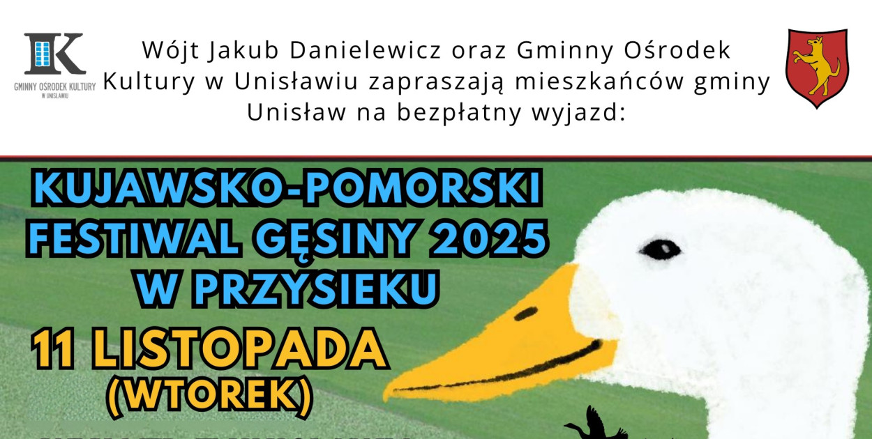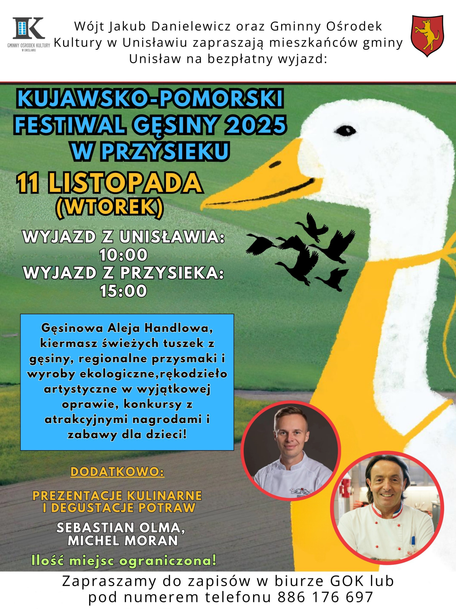 We wtorek, 11 listopada nie zabraknie degustacji potraw z gęsiny, konkursów oraz pokazów kulinarnych. Urząd Gminy i Gminny Ośrodek Kultury w Unisławiu zapraszają na bezpłatny wyjazd na to wydarzenie.