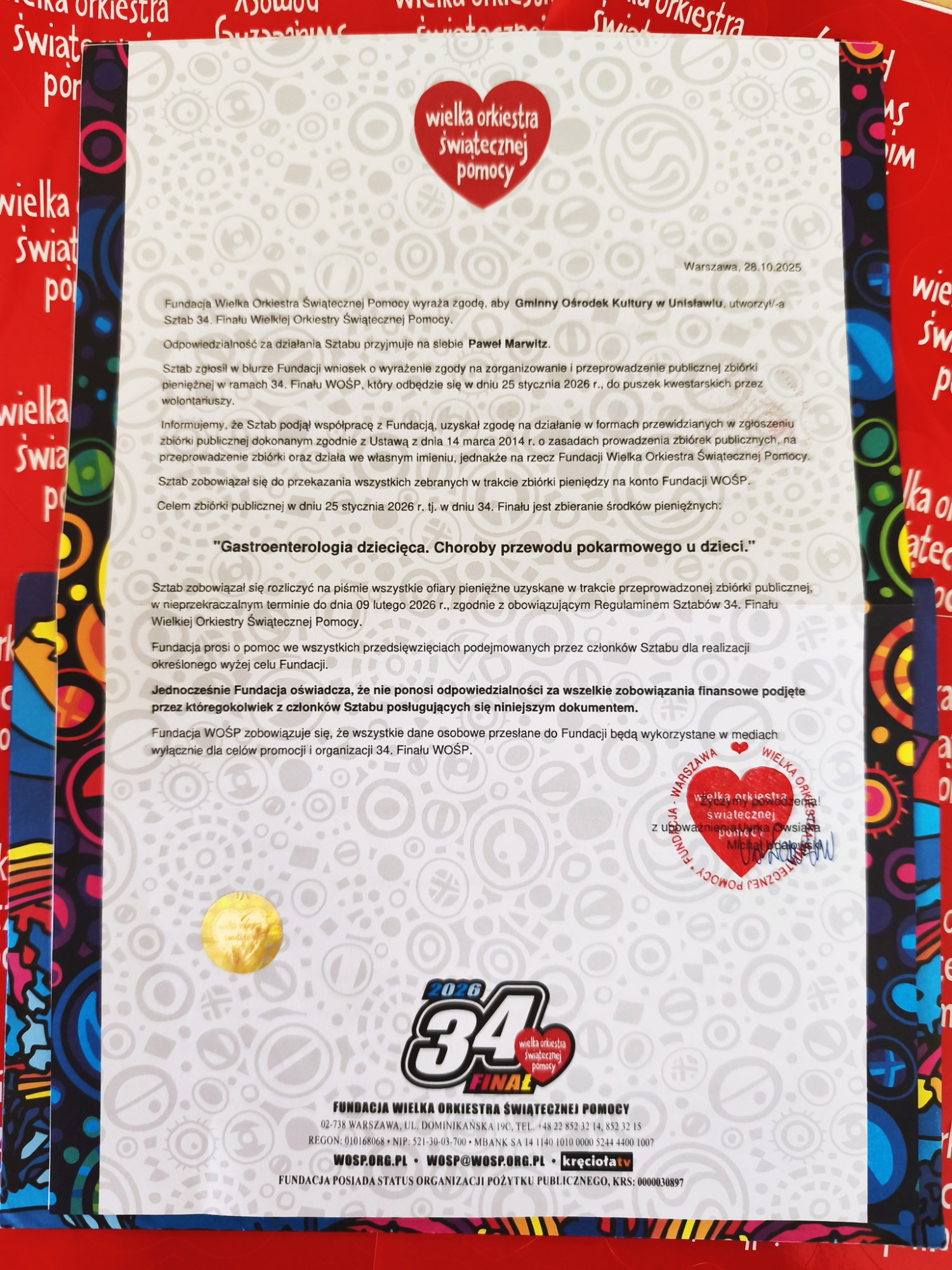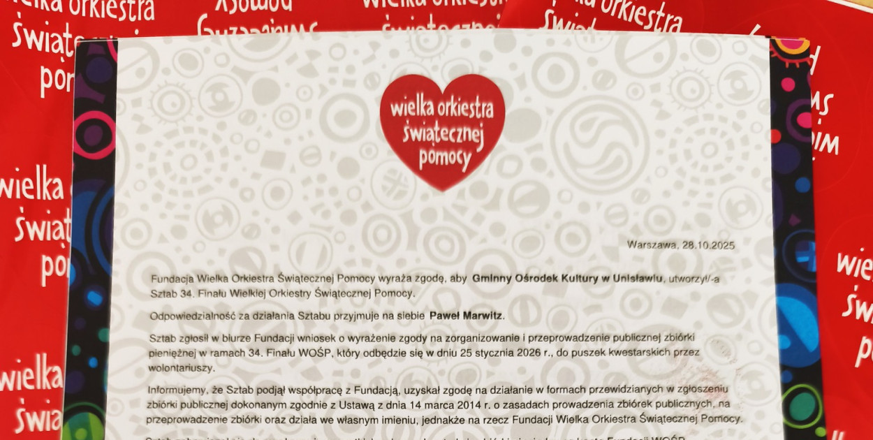 To już pewne GOK w Unisławiu otrzymał zielone światło na utworzenie Sztabu Wielkiej Orkiestry Świątecznej Pomocy od Fundacji WOŚP Finał WOŚP zagra 25 stycznia 2026 roku Celem zbiórki publicznej będzie "Gastroenterologia dziecięca. Choroby przewodu pokarmowego u dzieci".