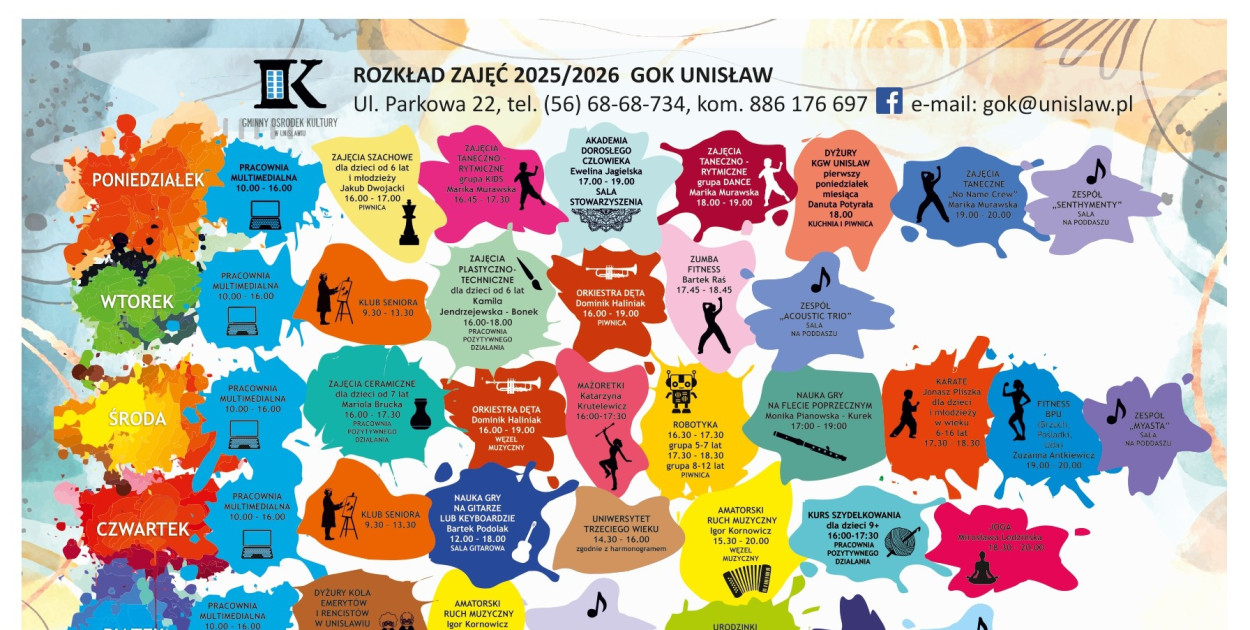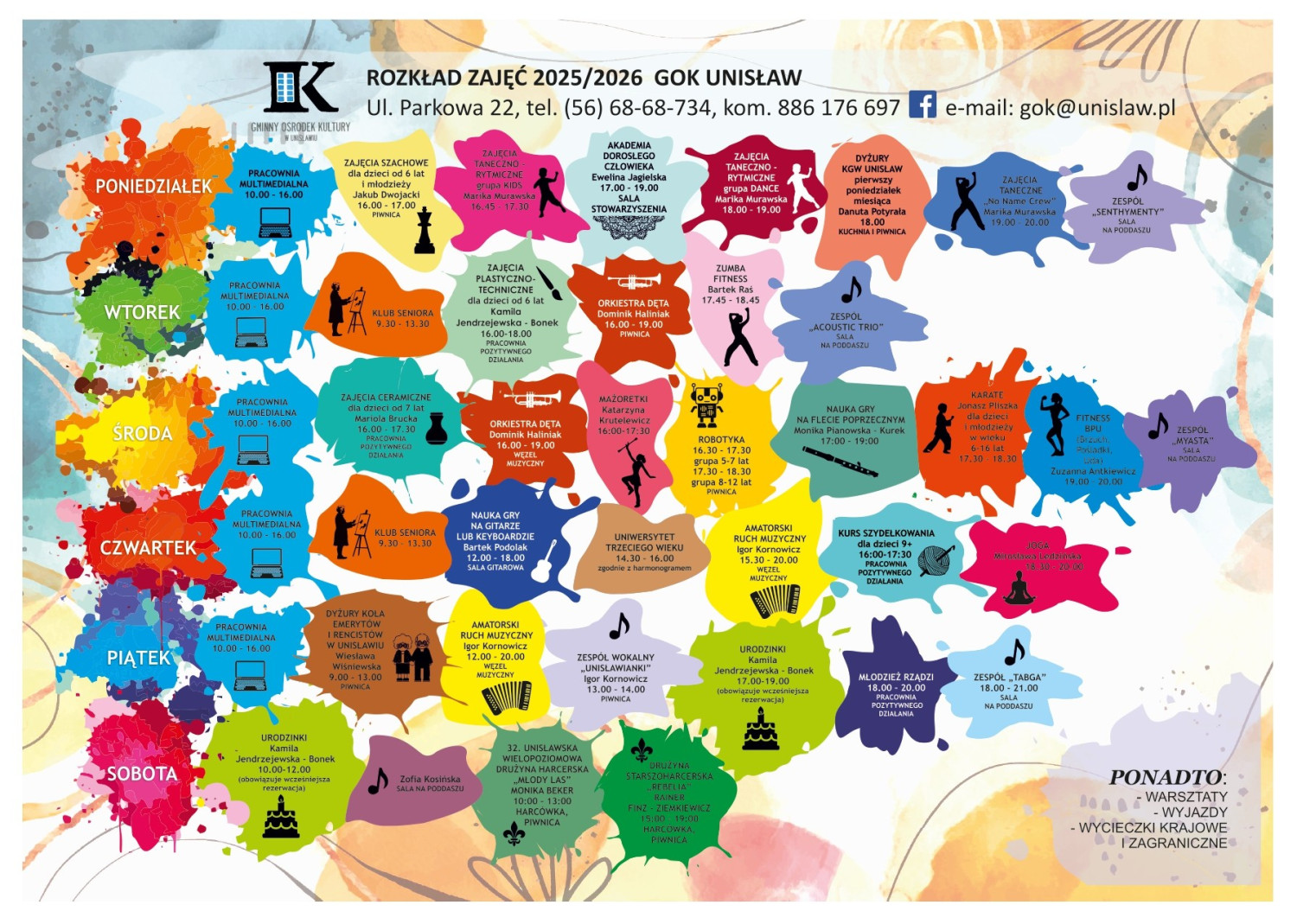 Zajęcia odbywają się w różnych dniach tygodnia. Szczegółowy harmonogram, wraz z informacjami o zapisach oraz kosztach, dostępny jest na stronie internetowej gokunislaw.pl, facebooku oraz pod numerem telefonu 56 68 68 734 oraz w biurze GOK, przy ul. Parkowej 22.