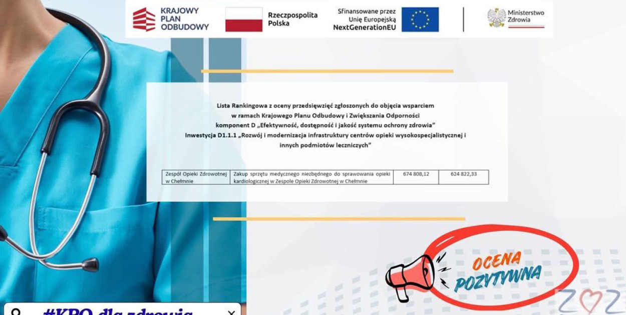 Zespół Opieki Zdrowotnej w Chełmnie otrzyma na zakup i wymianę aparatury medycznej na potrzeby świadczeń kadriologicznych - ponad 600 000,00 zł.