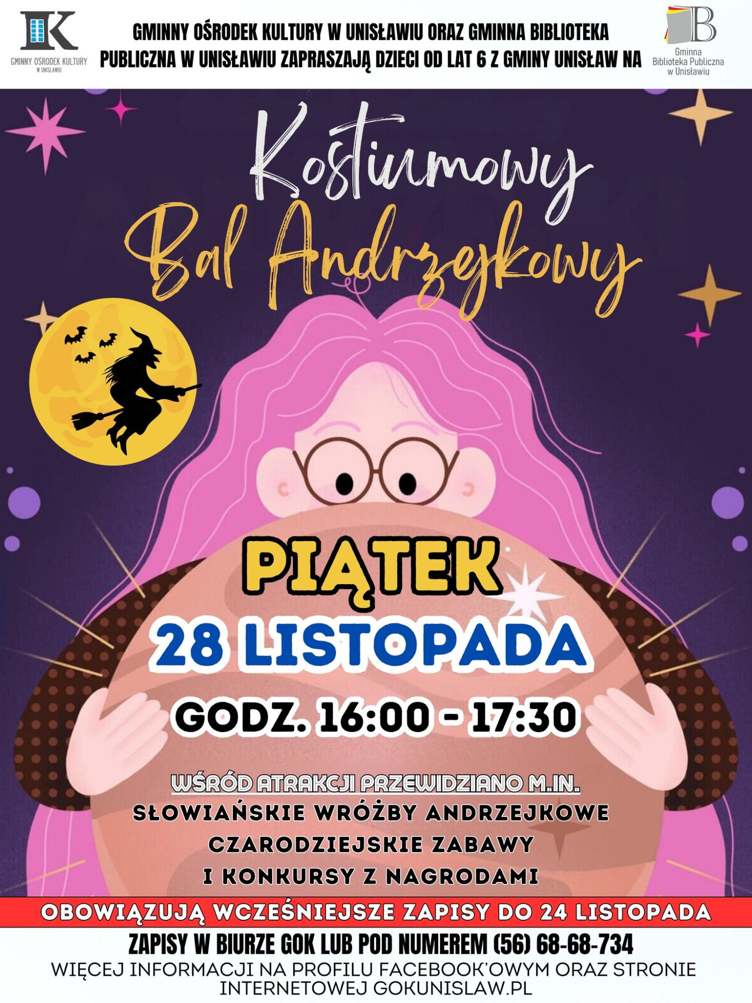 Już 28 listopada, w piątek od 16:00 do 17:30, czeka niezapomniana zabawa pełna tajemniczych wróżb, czarów i radosnych tańców! Wraz z Gminna Biblioteka Publiczna w Unisławiu zapraszamy wszystkie dzieci od 6 lat z gminy Unisław do wspólnej, pełnej niespodzianek przygody.