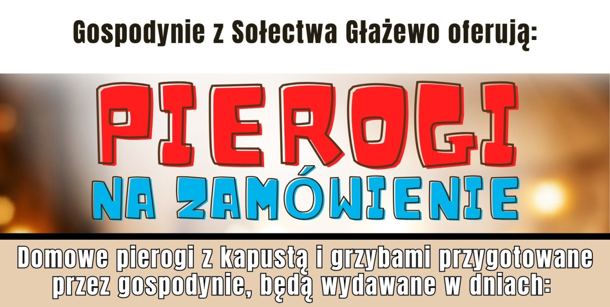 Gospodynie z Sołectwa Głażewo oferują domowe pierogi z kapustą i grzybami/pieczarkami na zamówienie. Pierogi będą wydawane 6 grudnia (sobota) na stoisku podczas Jarmarku Bożonarodzeniowego w Unisławiu w godz. 14:00-18:00 lub w Głażewie w uzgodnionym wcześniej terminie.