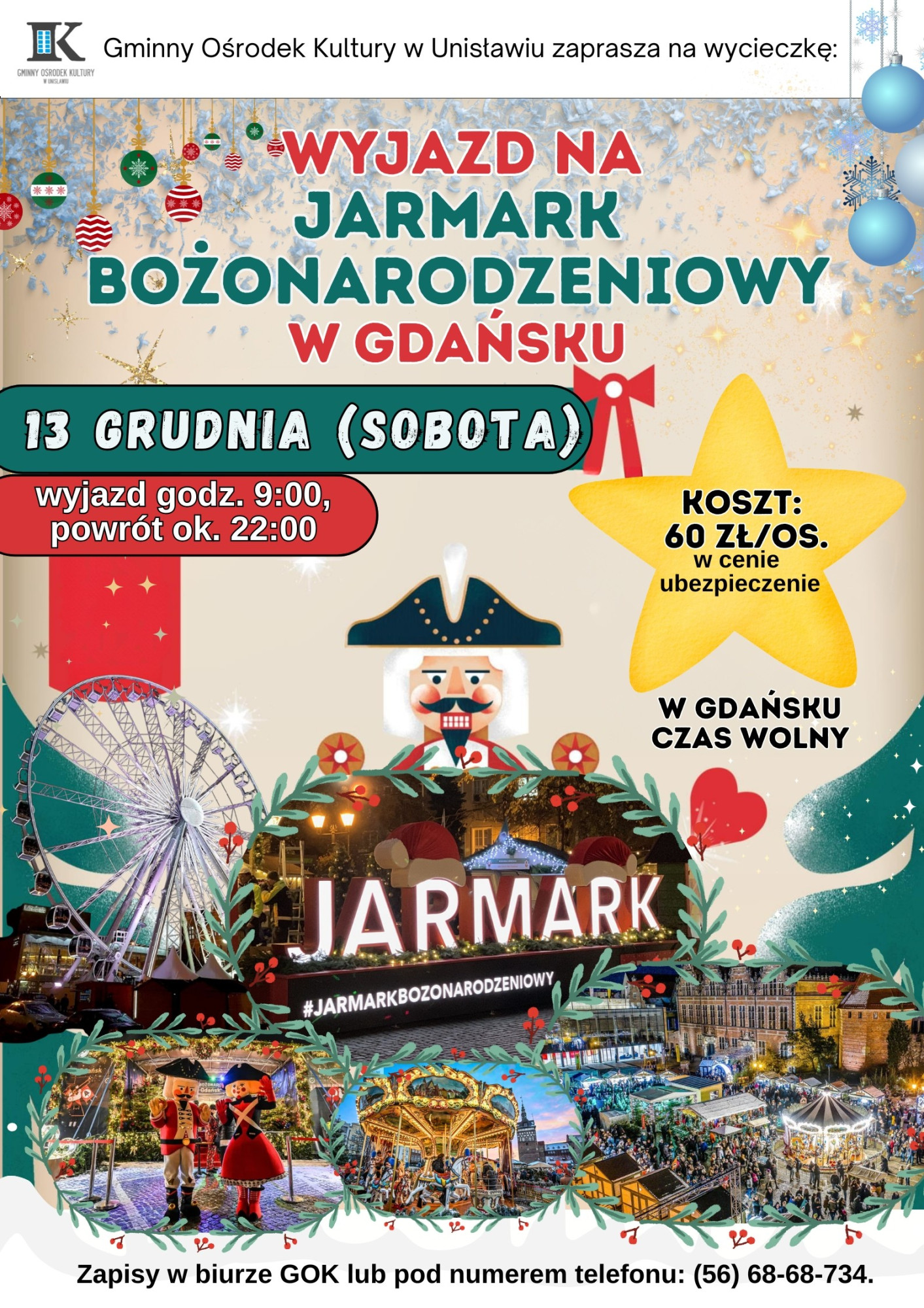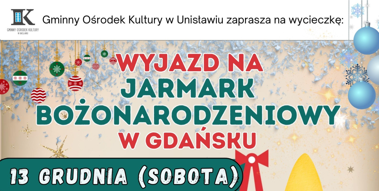 Gminny Ośrodek Kultury w Unisławiu serdecznie zaprasza rodziny z dziećmi z gminy Unisław na wyjazd do Gdańska na Jarmark Bożonarodzeniowy, który odbędzie się 13 grudnia (sobota). Wyjazd spod GOK-u o godzinie 09:00, natomiast powrót do Unisławia około 22:00.