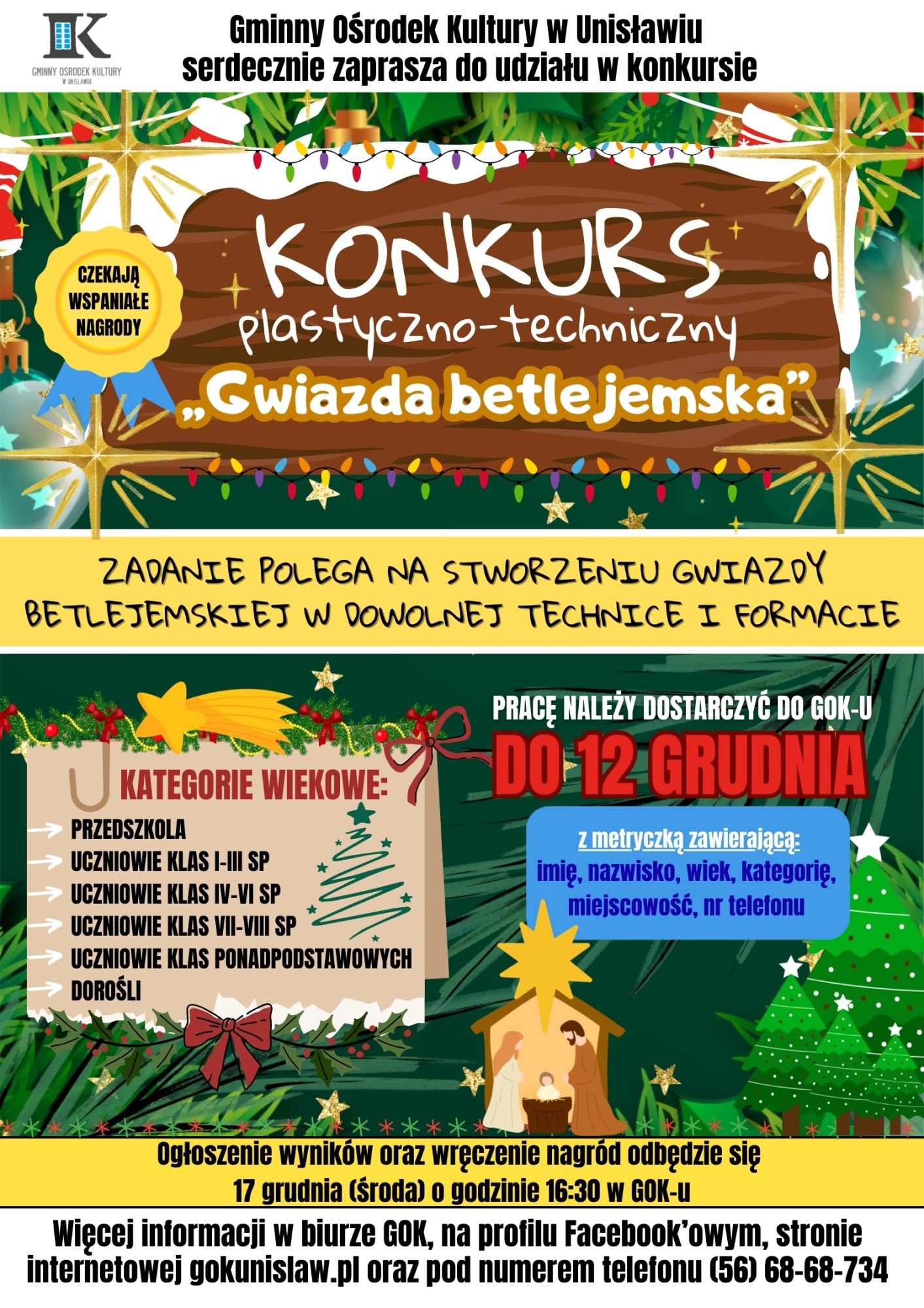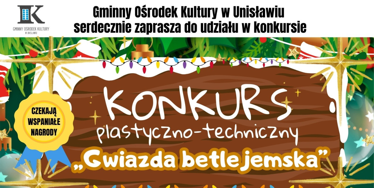 Gminny Ośrodek w Unisławiu zaprasza do udziału w konkursie plastyczno-technicznym. Zadanie polega na stworzeniu gwiazdy betlejemskiej w dowolnej technice i formacie. Konkurs będzie rozstrzygany w kategoriach wiekowych: oddziały przedszkolne, uczniowie klas I-III SP, IV-VI SP, VII-VIII SP, klas ponadpodstawowych oraz dorośli.