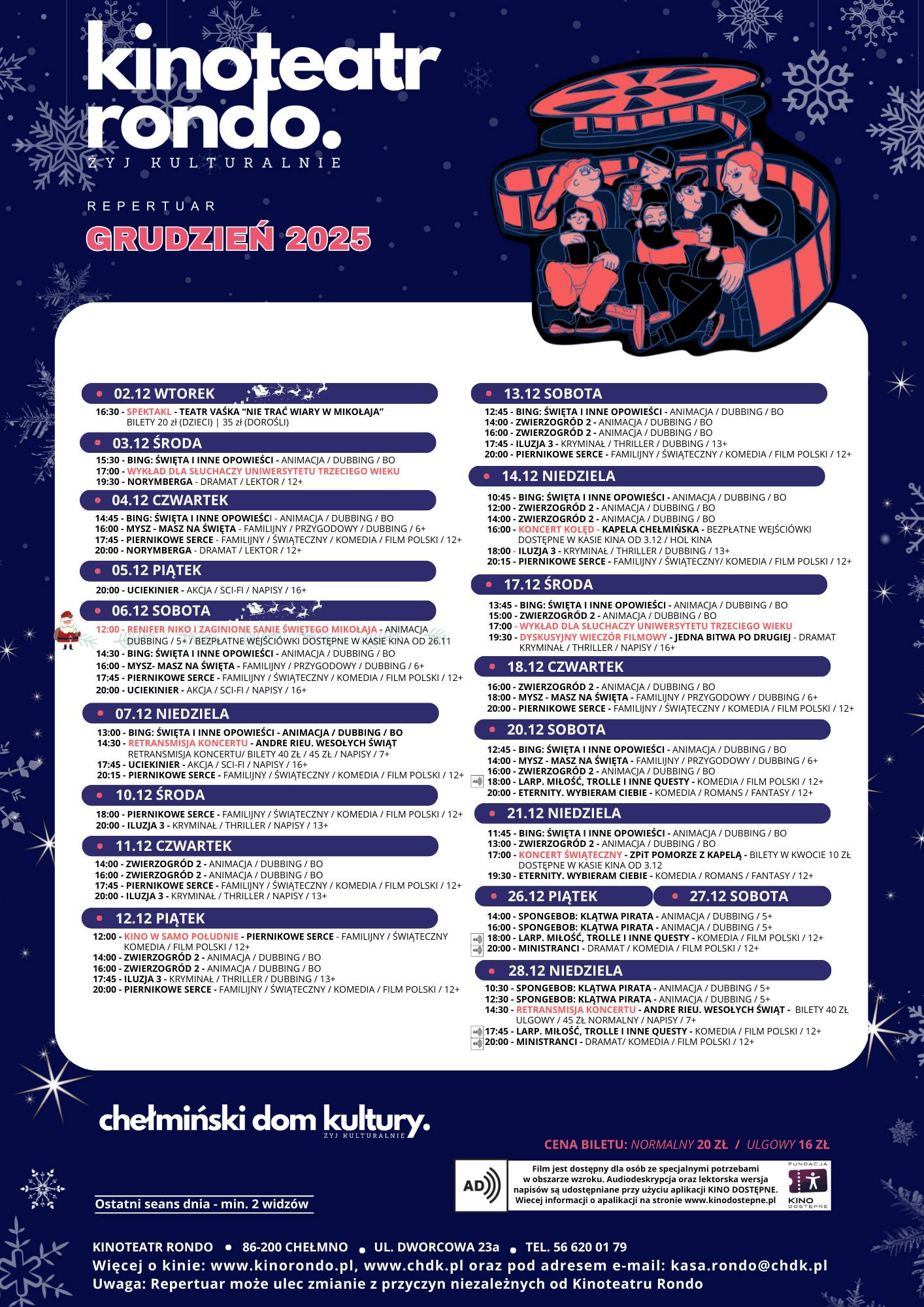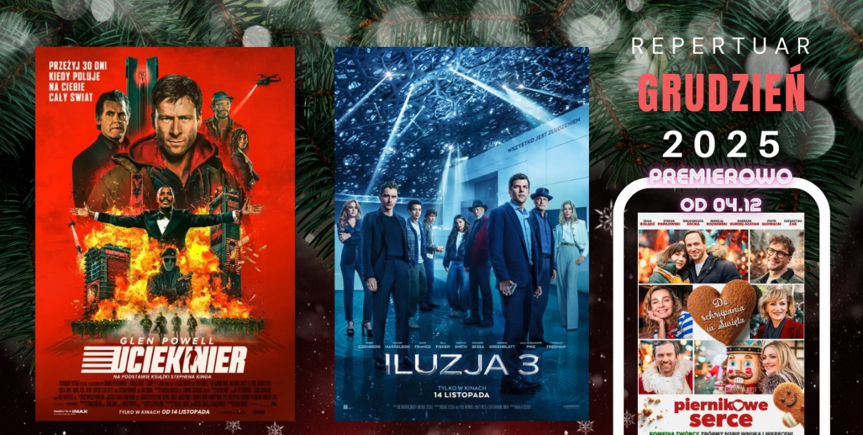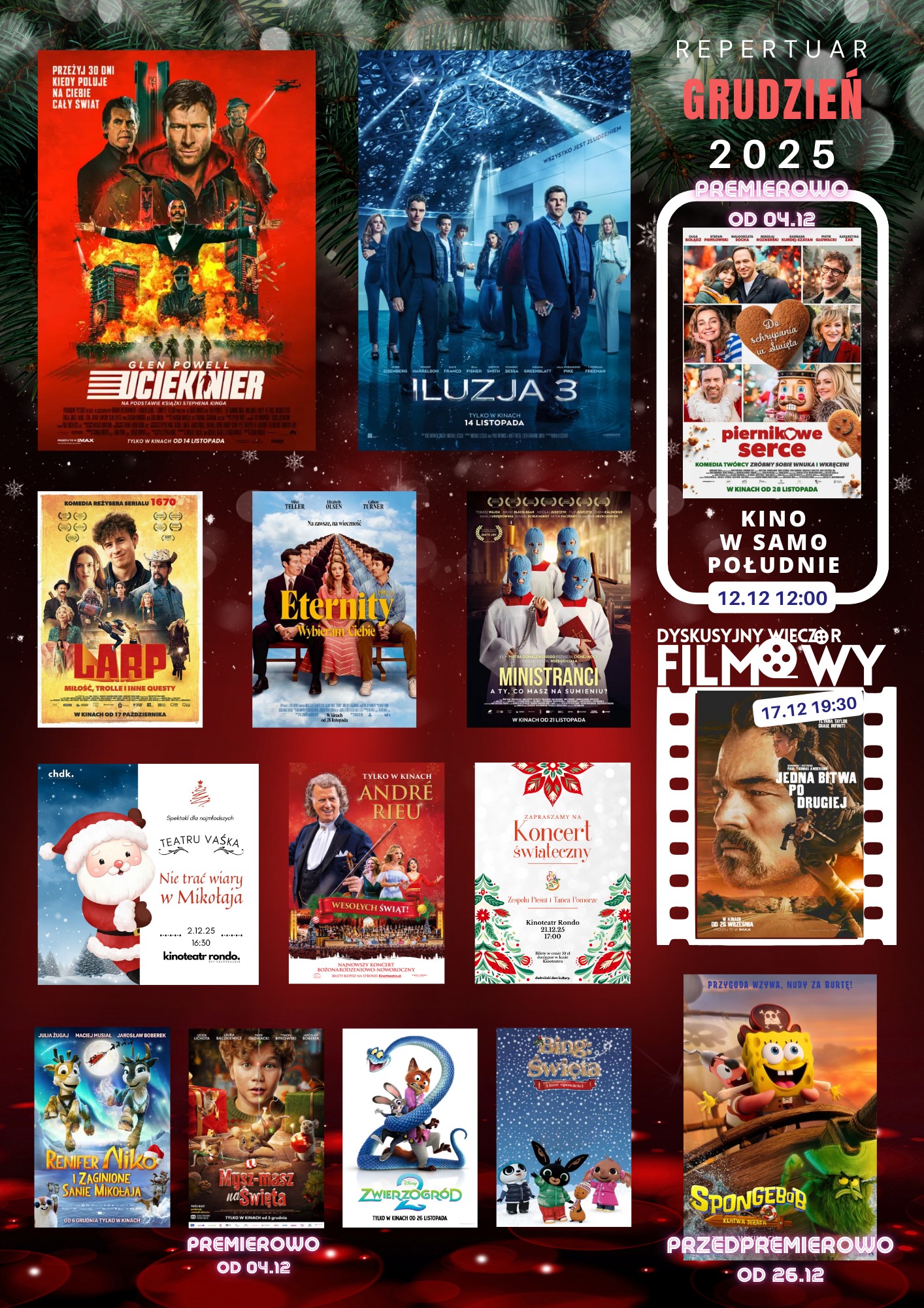 Zapraszamy na filmowy miesiąc pełen magii, emocji i świątecznego klimatu! W grudniowym repertuarze znajdziecie animacje dla najmłodszych, familijne opowieści, komedie, kino akcji, thrillery, a także specjalne wydarzenia – koncerty, spotkania i seanse świąteczne.