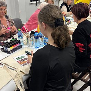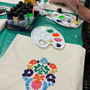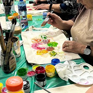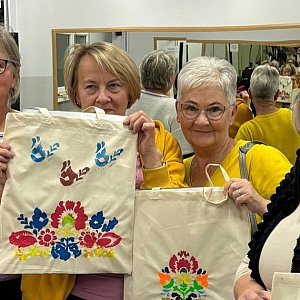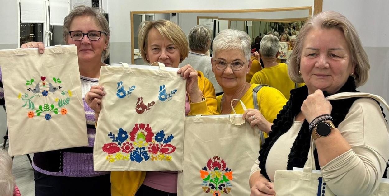 Międzypokoleniowe spotkanie integracyjne w ramach warsztatów „W kręgu pieśni i tradycji”. W przyjaznej atmosferze uczestnicy projektu Klub Seniora „Złoty Krąg” wraz z młodzieżą malowali torby-szoperki inspirowane motywami ludowymi.