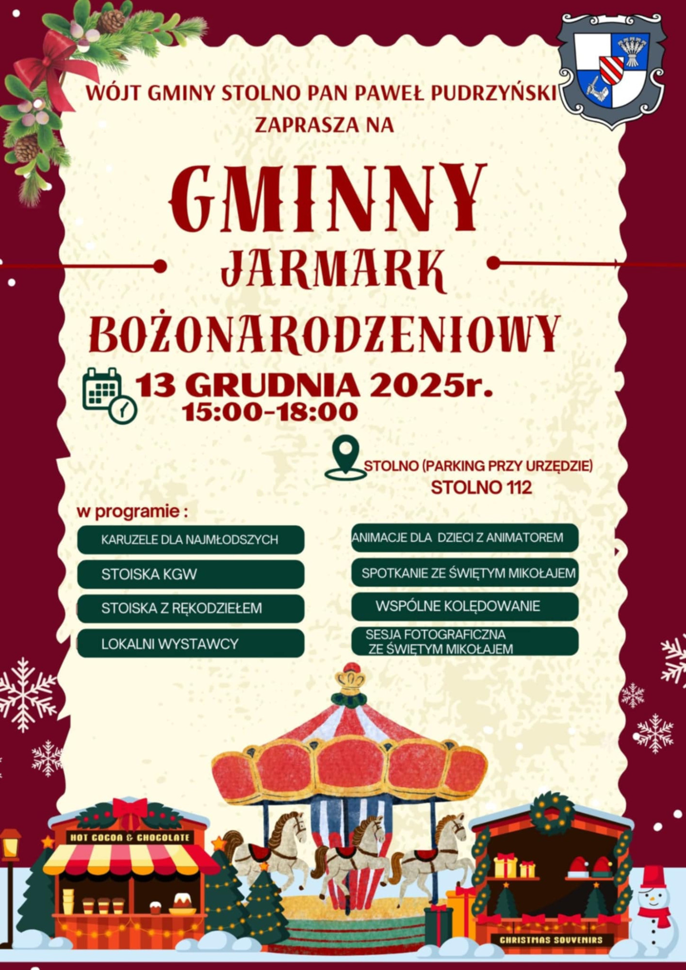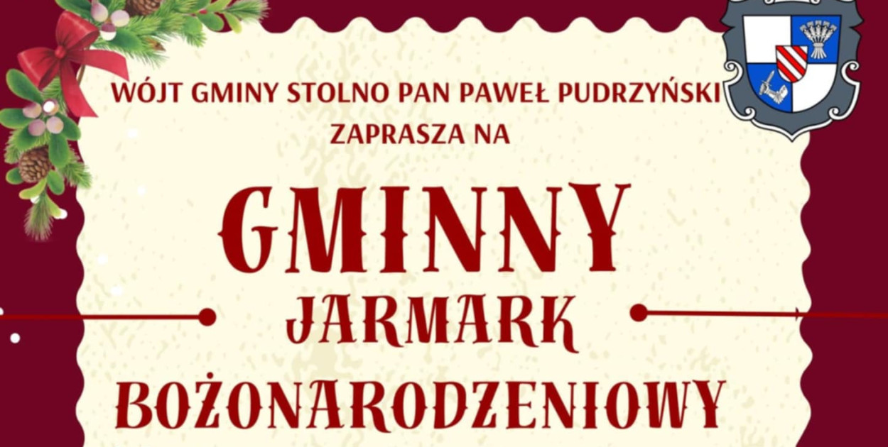 Wójt Gminy Stolno Pan Paweł Pudrzyński zaprasza na GMINNY JARMARK BOŻONARODZENIOWY 13 grudnia 2025 r., godz. 15:00–18:00.