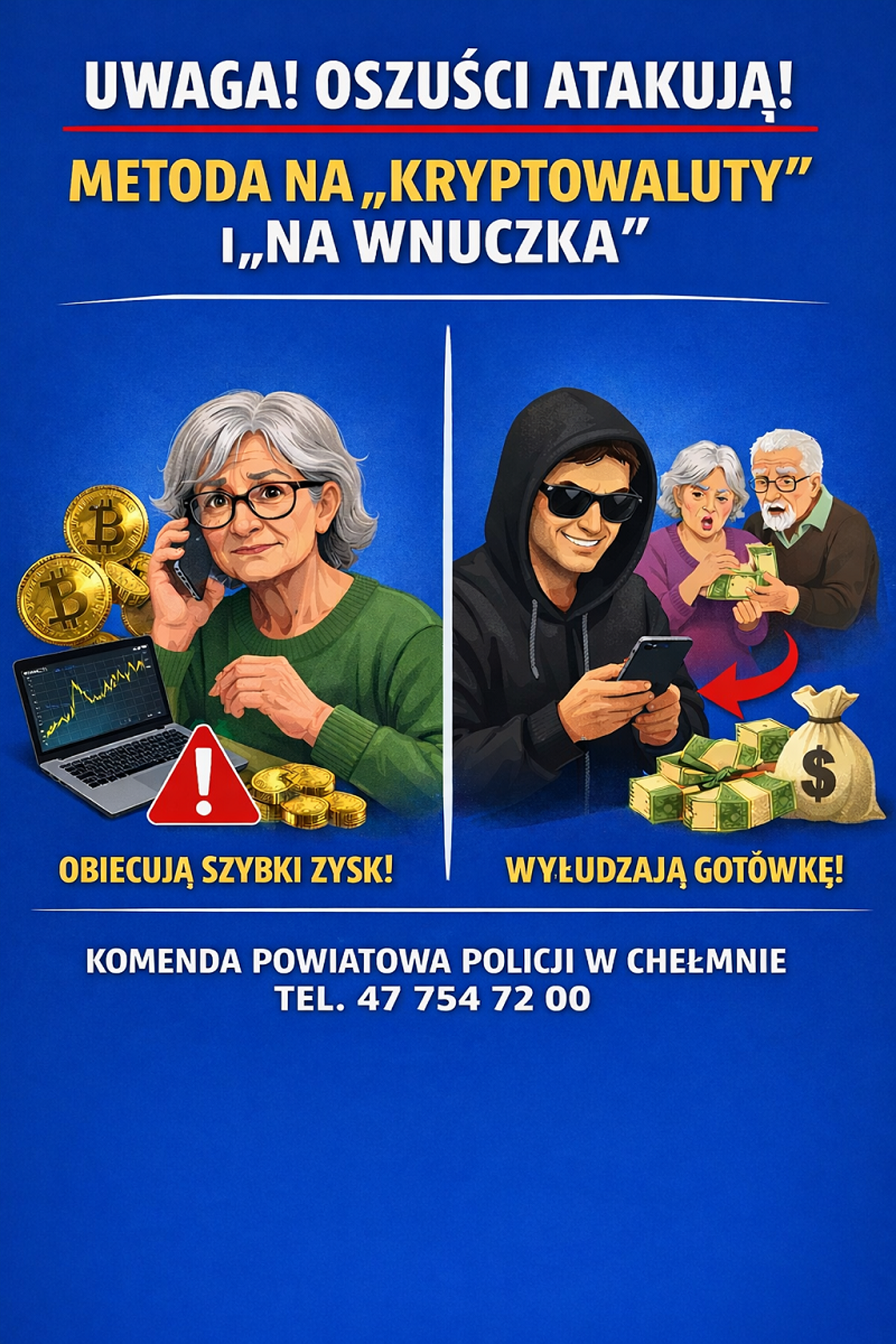 W związku ze zbliżającymi się świętami policjanci z Chełmna apelują o zachowanie szczególnej czujności wobec prób oszustw, których ofiarami najczęściej padają osoby starsze. Przestępcy działają telefonicznie oraz za pośrednictwem internetu, stosując różne metody manipulacji, których celem jest wyłudzenie pieniędzy, danych osobowych lub dostępu do kont bankowych. Do najczęściej spotykanych należą oszustwa związane z rzekomym inwestowaniem w kryptowaluty, oszustwa „na policjanta" oraz „na wnuczka".