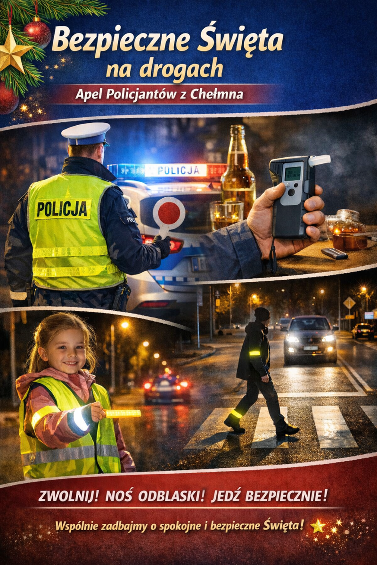 W okresie świątecznym na drogach Chełmna i okolic pojawi się więcej patroli policyjnych, które będą dbać o bezpieczeństwo wszystkich uczestników ruchu drogowego i reagować na wszelkie zagrożenia. Policjanci apelują o rozwagę, przestrzeganie przepisów oraz wzajemny szacunek - razem zadbajmy o bezpieczne świąteczne podróże.