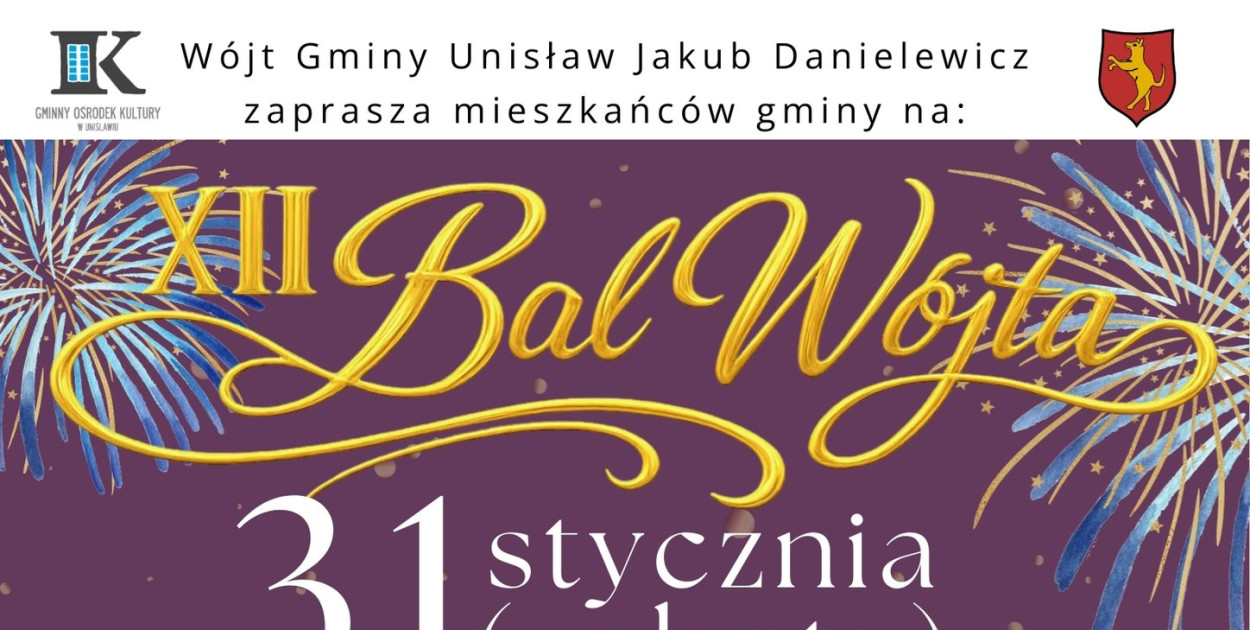 Wójt Kuba Danielewicz zaprasza pełnoletnich mieszkańców gminy Unisław na XII Bal Wójta, który odbędzie się 31 stycznia(sobota). Impreza rozpocznie się o godz. 19:00 i potrwa do godz. 2:00 w nocy.
