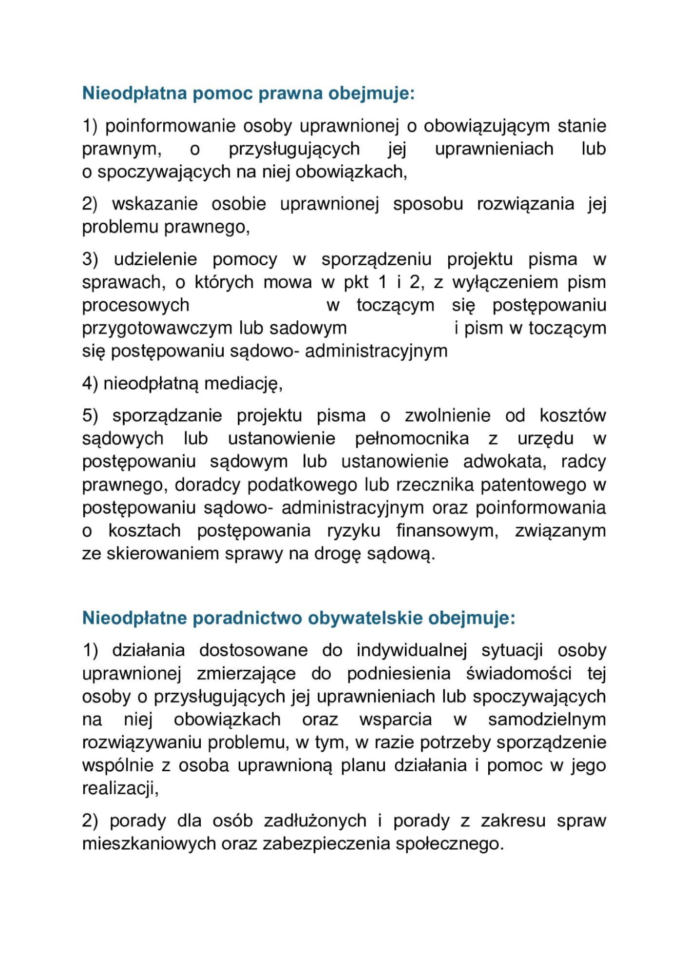 Nieodpłatna pomoc prawna i nieodpłatne poradnictwo obywatelskie przysługują osobie uprawnionej, która nie jest w stanie ponieść kosztów odpłatnej pomocy prawnej w tym osobie fizycznej prowadzącej jednoosobową działalność gospodarczą niezatrudniającą innych osób w ciągu ostatniego roku.
