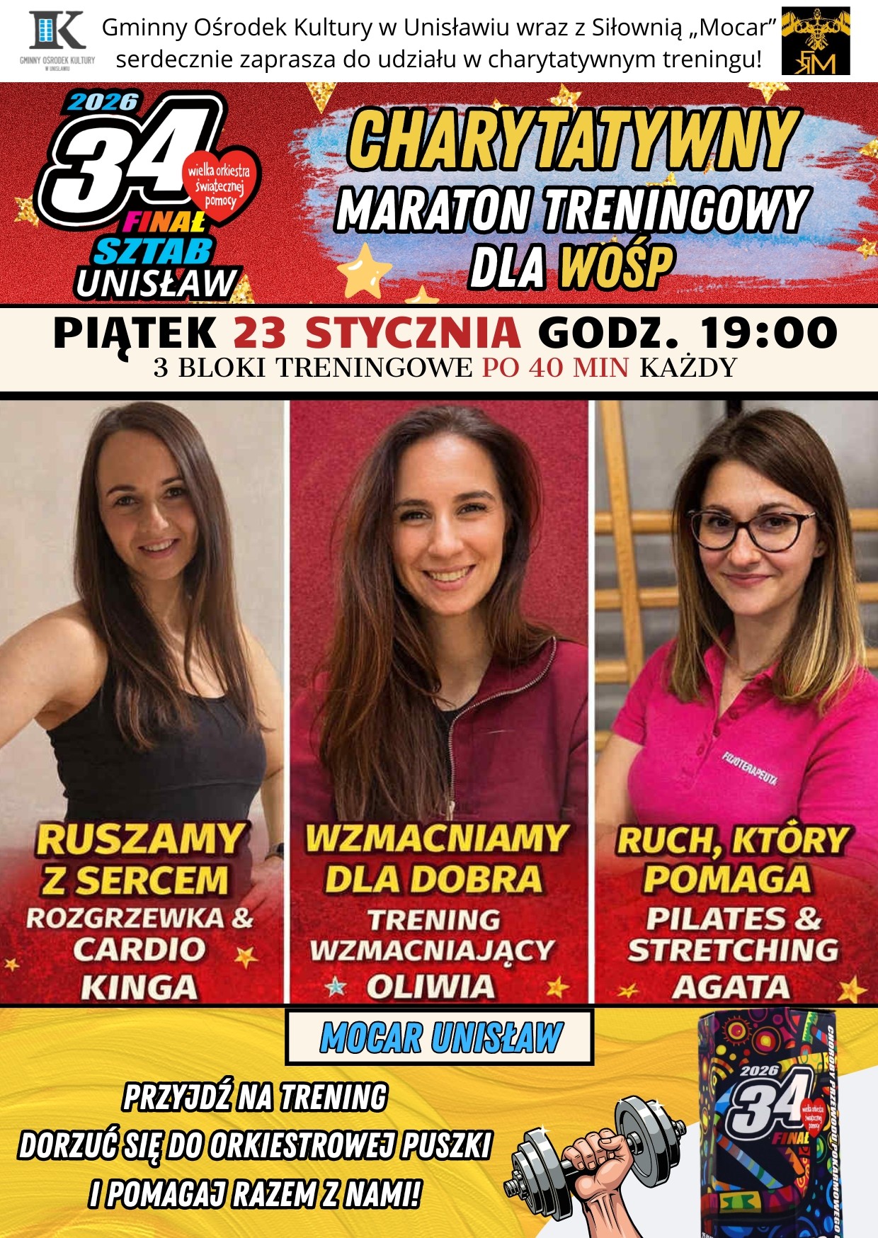 23 stycznia (piątek) godz. 19:00 – Charytatywny maraton treningowy dla WOŚP w siłowni Mocar! W roli głównej Kinga, Oliwia i Agata, które przeprowadzą trzy bloki treningowe, po 40 minut każdy. Nie zabraknie rozgrzewki, cardio, treningu wzmacniającego, pilatesu i stretchingu. Nie liczy się forma, wiek ani doświadczenie. Liczy się chęć pomocy i wspólna energia! Dorzuć się do orkiestrowej puszki, włącz się do akcji i trenuj razem z nami!