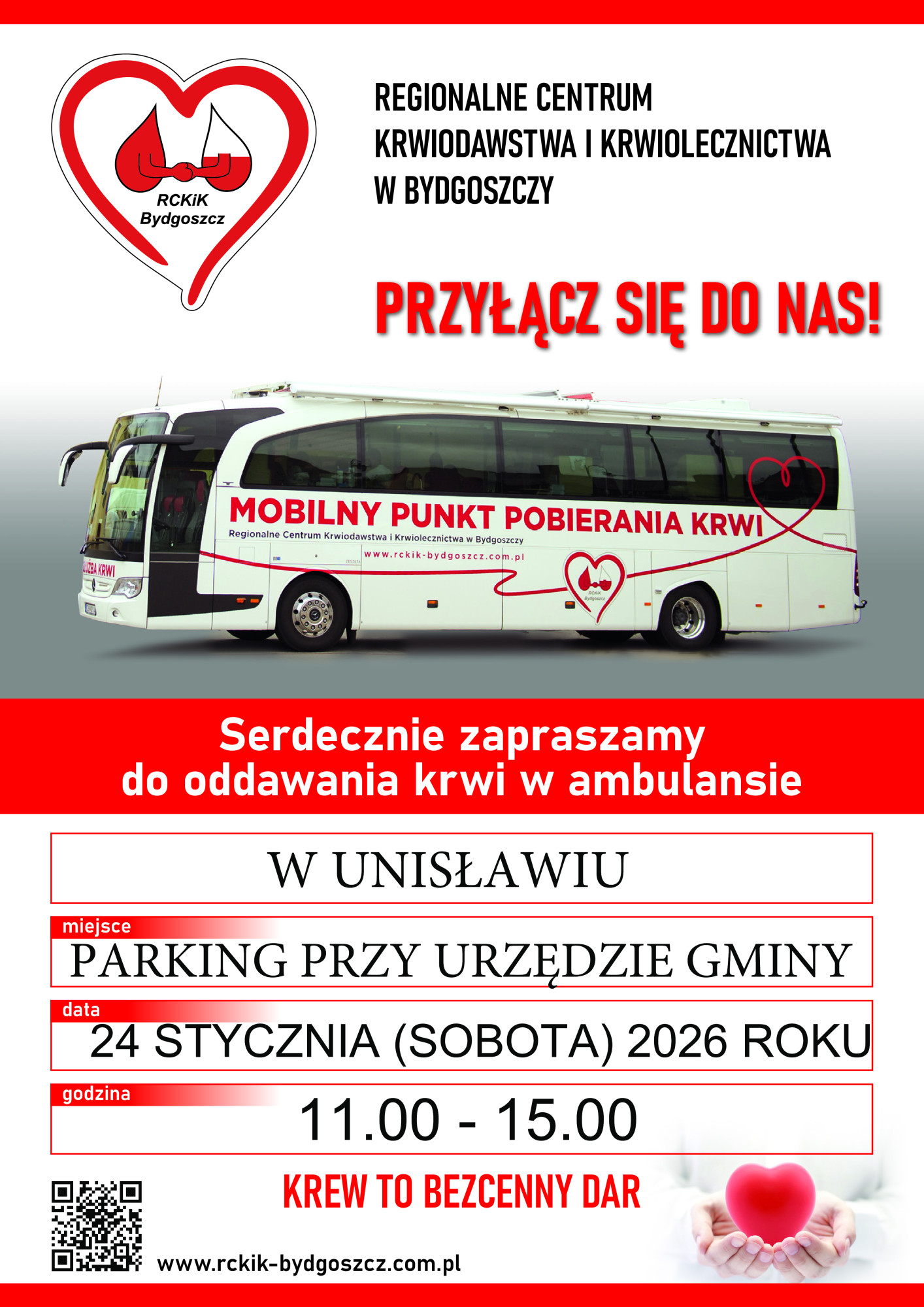24 stycznia (sobota) w godz. 11:00 – 15:00 – Akcja krew! Osoby, które wyrażają chęć oddania krwi muszą spełniać określone wymagania m.in. muszą to być osoby zdrowe, pełnoletnie, nieprzekraczające 65 roku życia i ważące przynajmniej 50kg. Uwaga! Należy zabrać dokument potwierdzający tożsamość. Pobór krwi odbędzie się w specjalnym krwiobusie, który będzie znajdował się na parkingu przy Urzędzie Gminy w Unisławiu.