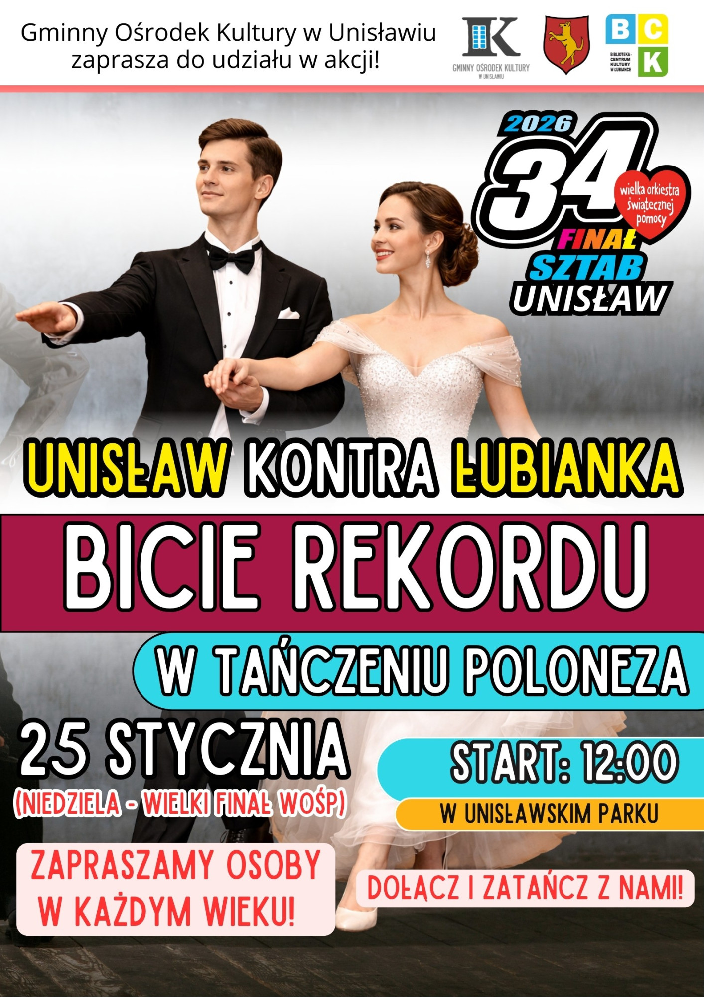 25 stycznia (niedziela) - Na Wielki Finał nadszedł czas! Niedzielny program rozpocznie się o godz. 12:00 biciem rekordu w tańczeniu Poloneza. Rekord polega na zebraniu największej ilości osób, biorących udział w tańcu. Zachęcamy wszystkich!