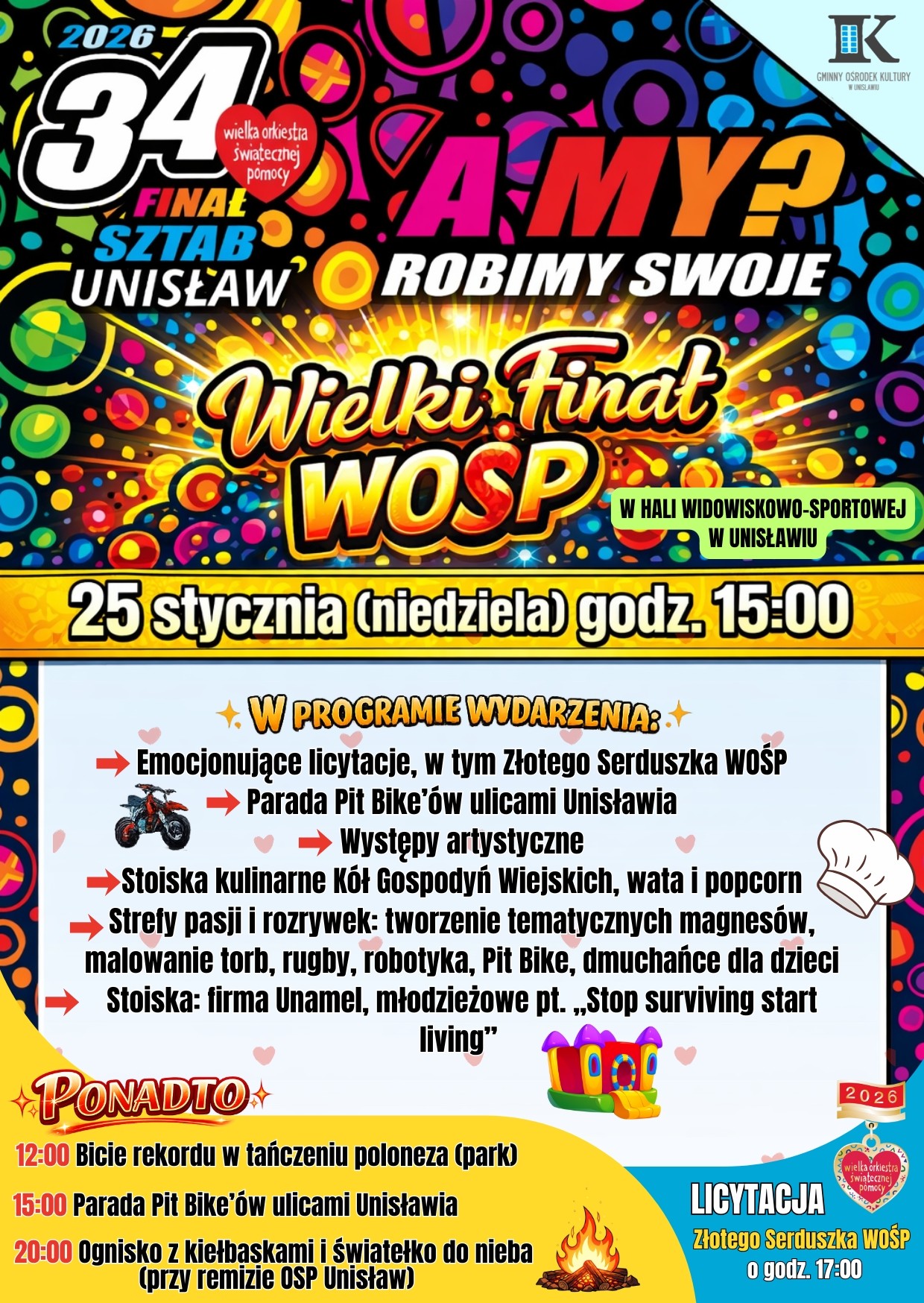 Całość niedzielnego orkiestrowania o godz. 15:00 rozpocznie parada Pit Bike’ów ulicami Unisławia. Następnie w hali widowiskowo-sportowej dostępne będą atrakcje, m.in. występy artystyczne, stoiska: kulinarne, firma Unamel, młodzieżowe pt. „Stop surviving start living”, strefy pasji i rozrywek, tj. tworzenie tematycznych magnesów, malowanie toreb, rugby, robotyka, Pit Bike, dmuchańce dla dzieci. Nie zabranie również emocjonujących licytacji, w tym Złotego Serduszka WOŚP, którego licytacja rozpocznie się o godz. 17:00. Całość wydarzenia zwieńczy ognisko z kiełbaskami przy remizie OSP Unisław oraz światełko do nieba, na które zapraszamy o godz. 20:00.