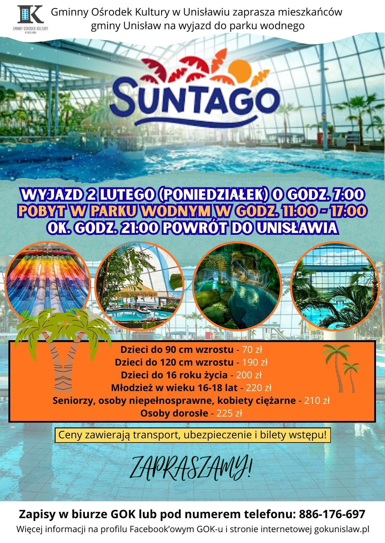 Serdecznie zapraszamy mieszkańców Gminy Unisław do udziału w wycieczce do parku wodnego Suntago! To doskonała okazja, aby aktywnie i radośnie spędzić czas podczas ferii zimowych... pod palmami! Termin: 2 lutego (poniedziałek).