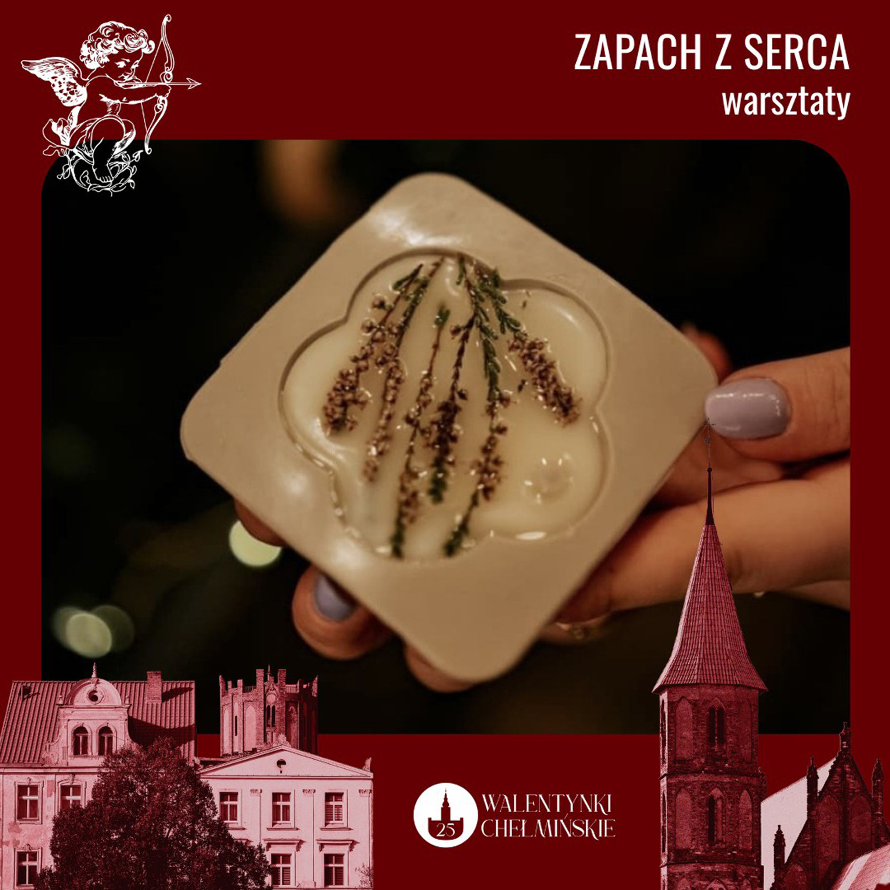 Podczas spotkania uczestnicy własnoręcznie wykonają zawieszkę zapachową z naturalnego wosku sojowego, poznając podstawowe zasady ręcznego tworzenia produktów zapachowych Każdy wybierze swój ulubiony aromat spośród naturalnych kompozycji zapachowych oraz nada zawieszce unikalny charakter, dekorując ją naturalnymi dodatkami.