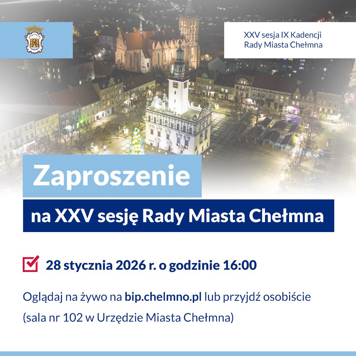 Zapraszamy na XXV sesję Rady Miasta Chełmna – środa, 28 stycznia 2026 r. o godz. 16:00 w sali nr 102 Urzędu Miasta Chełmna ul. Dworcowa 1