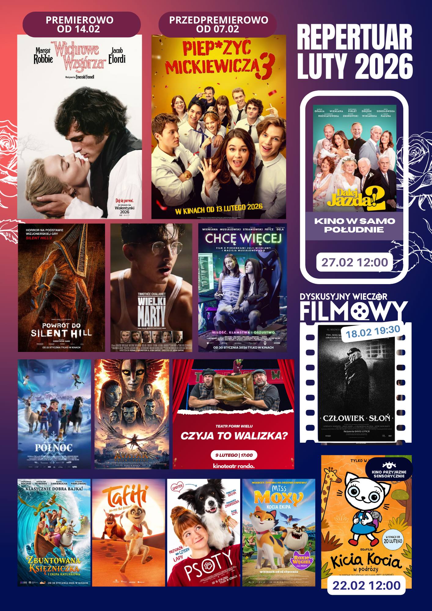W lutym w naszym kinie czeka na Was mnóstwo filmowych emocji – od familijnych animacji, przez kino przygodowe i komedie, aż po mocne dramaty i horrory.