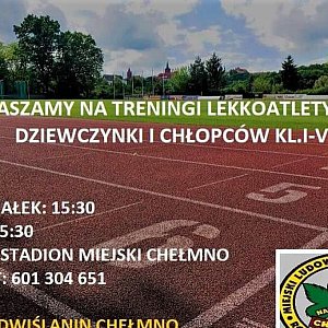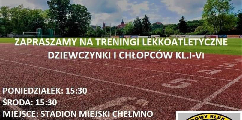 Zapraszamy na treningi lekkoatletyczne dziewczynki i chłopców z klas I-VI. Treningi odbywają się w poniedziałki o godz. 15:30, w środy o godz. 15:30 na Stadionie Miejskim w Chełmnie.