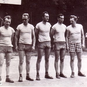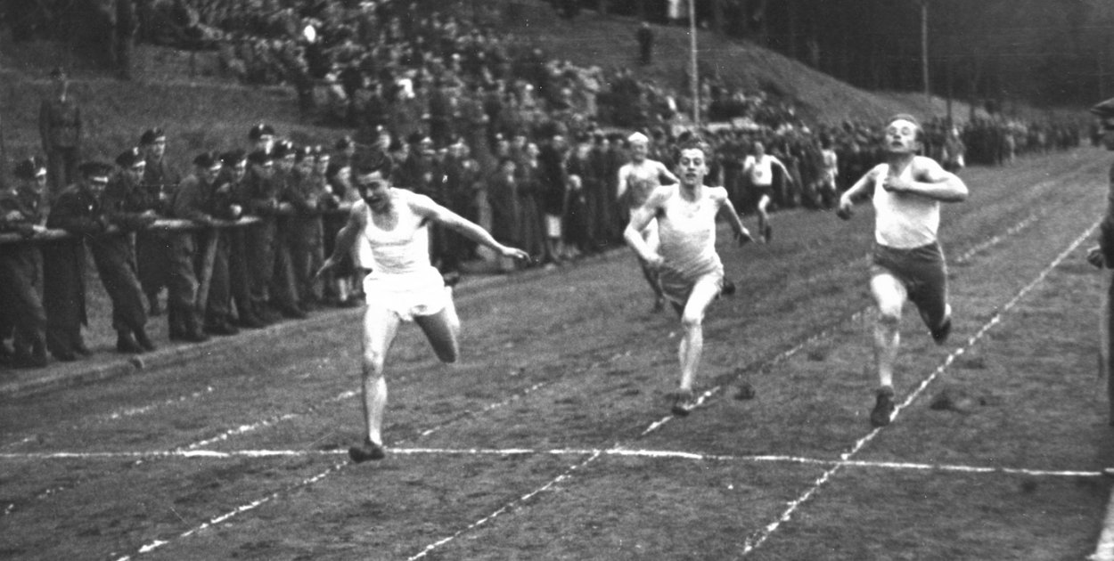 /zdj. główne: zawody w Chełmnie 1 maja 1954 roku, od lewej Adam Rohnka (wygrywa) i Tadeusz Schmelter (2. miejsce), fot. arch. klubu/