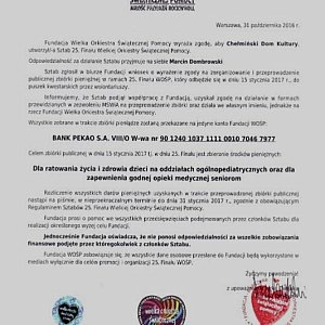 Wielka Orkiestra Świątecznej Pomocy działa na naszym terenie od 1996 roku. W styczniu 2016 roku udało się zebrać ok. 41 tysięcy złotych, natomiast przez wszystkie lata działania, założonej przez Jerzego Owsiaka organizacji charytatywnej, ludzie dobrej woli podarowali przeszło pół miliona złotych w tak małym miasteczku jakim jest Chełmno. To ogromny sukces !!! Już niebawem 60 wolontariuszy ze specjalnie oznakowanymi puszkami będzie zbierało pieniądze na szczytny cel: