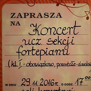 Dnia 29.11.2016 o godz. 17:00 w sali koncertowej Państwowej Szkoły Muzycznej odbył się koncert uczniów sekcji fortepianu. Dla adeptów klas pierwszych był to swego rodzaju egzamin nowo nabytych umiejętności, a dla dzieci ze starszych klas dobra okazja, aby zaprezentować rodzicom i kolegom postępy w nauce. Zajęcia dodatkowe i rozwijanie swoich pasji to ważny element życia młodych ludzi.