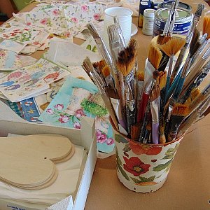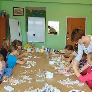Zdobienie techniką decoupage?u pozwala ze zwykłych przedmiotów stworzyć oryginalne dzieła sztuki. Powierzchnie drewna, metalu, szkła czy porcelany okleja się serwetkami lub obrazkami z papieru. Przedmioty w ten sposób ozdobione zyskują szlachetny wygląd i starą duszę, jak gdyby pochodziły z poprzedniej epoki. Jest to bardzo modne hobby i pomysł na kreatywne spędzanie czasu. Wystarczy tylko trochę wyobraźni, czasu i odpowiedni dobór materiałów. Chełmiński Dom Kultury zorganizował 10.08.2016 warsztaty, w których wzięło udział 15 dzieci w wieku od 8 do 12 lat. Zajęcia poprowadziła pani Anna Pawlak.