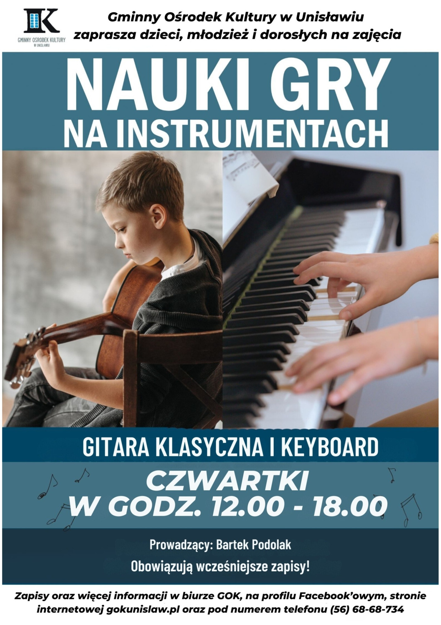 Gminny Ośrodek Kultury w Unisławiu wraz z instruktorem Bartkiem Podolakiem serdecznie zapraszają dzieci, młodzież i dorosłych do udziału w zajęciach nauki gry na instrumentach!