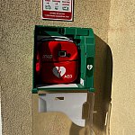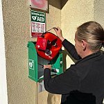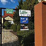Defibrylator w ochronnej szafce powieszony jest na ścianie budynku przy wejściu na halę sportową przy ul. Szkolnej 6 w Chełmnie