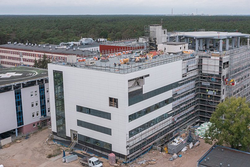 Ekipy wykonawców kontynuują obecnie prace murarskie, montażowe i wykończeniowe obejmujące m.in. montaż ścianek działowych, wzmocnienie ścian i stropów pod montaż urządzeń medycznych, montaż płyt elewacyjnych, tynkowanie, układanie posadzek, malowanie natryskowe oraz roboty blacharskie pod płytą lądowiska dla helikopterów.