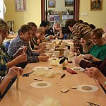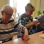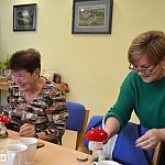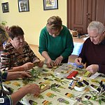 Seniorzy z dokładnością i starannością wykonali zakładki do książek metodą cyjanotypii oraz grzybki z tkaniny Z rękodzielniczymi zadaniami Seniorzy poradzili sobie znakomicie Twórczy czas przeplatały wspólne rozmowy przy kawie i herbacie oraz słodkim poczęstunku.