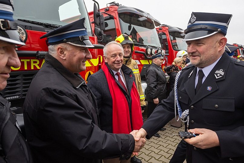 – Konsekwentne wspieranie służb ratowniczych jest częścią polityki samorządu województwa od wielu lat. Dzięki temu nasycenie sprzętem jednostek w naszym regionie jest już na naprawdę bardzo wysokim poziomie. Mamy wypracowane mechanizmy tego typu działań, dlatego jesteśmy pewni, że dokonywane zakupy są przemyślane i potrzebne. W ostatnim latach pomogliśmy w zakupie przeszło stu wozów bojowych, co trzecia jednostka OSP ma na stanie nowe wozy, średnia wieku auta to osiem lat. Jeśli dodam, że współfinansujemy też odnawianie, doposażanie i budowę remiz, często powiązanych ze świetlicami wiejskimi, to widzimy pełen zakres interwencji samorządu województwa w tej dziedzinie. Poczytujemy to sobie za obowiązek, realizację misji zapewnienia bezpieczeństwa mieszkańcom naszego regionu. Cieszę się, że dzięki funduszom unijnym możemy je tak skutecznie realizować – mówił przed uroczystością, która odbyła się przed Urzędem Marszałkowskim, marszałek Piotr Całbecki.