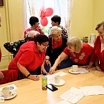 Seniorzy rozpoczęli dzień od pogawędek przy ciepłych napojach Następnie wzięli udział w wyjątkowym zadaniu - wymieniali się uprzejmościami i pozytywnymi określeniami, wypisując je sobie wzajemnie na kartkach umieszczonych na plecach! Nie zabrakło wspominek i opowieści miłosnych, które wywoływały szczere uśmiechy na twarzach uczestników Jednak największe emocje wywołała bitwa muzyczna - oj działo się!