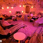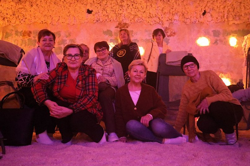 Seniorzy rozpoczęli przygodę w Jaskini solnej ALATI w Toruniu, gdzie już od progu otulił ich delikatny, słonawy mikroklimat i nastrojowe światło. Wygodne leżaki, spokojna muzyka i powietrze nasycone minerałami stworzyły idealne warunki do relaksu. Uczestnicy wycieczki z radością oddali się chwili wytchnienia – jedni zamknęli oczy i wsłuchiwali się w dźwięki relaksacyjnej melodii, inni rozmawiali półgłosem, ciesząc się wspólną obecnością. Seans w grocie solnej przyniósł odprężenie, wyciszenie i – jak zgodnie podkreślali – prawdziwą ulgę dla dróg oddechowych oraz ogólne poczucie lekkości.