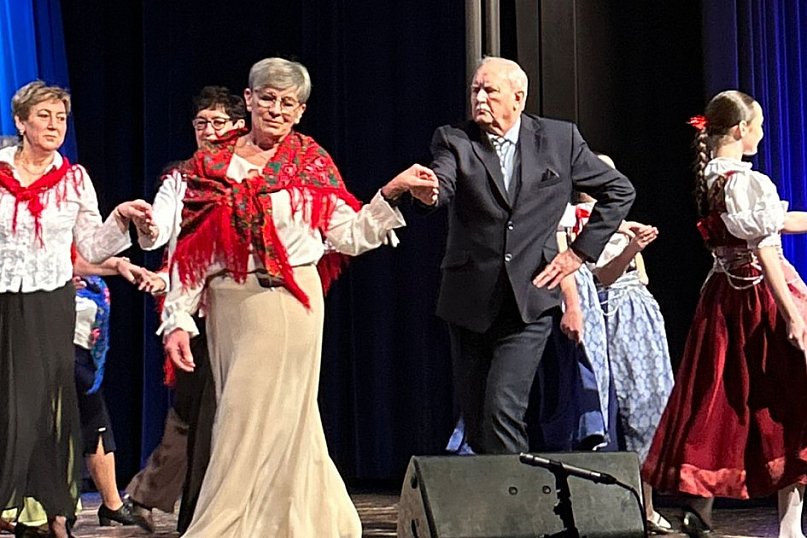 Polonez chełmiński w wykonaniu uczestników projektu Klub Seniora Złoty Krąg podczas oraz Zespół Pieśni i Tańca "Pomorze" Jubileuszu LGD Chełmno w Kinoteatr RONDO.