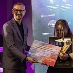 Pamiątkową statuetkę wręczył zwyciężczyni członek zarządu województwa Dariusz Kurzawa.