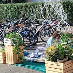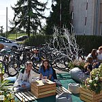 Na szkolnym boisku dwa miejsca parkingowe zostały wydzielone na postój dla rowerów, by pokazać uczniom ile terenu zajmuje samochód, a ile w tym samym miejscu może stanąć rowerów. Okazało się, że jest 10:1 dla rowerów!!! Ponadto na jednym wydzielonym miejscu uczniowie pod kierunkiem pani Marty Przybylskiej przygotowali zielone miejsce odpoczynku, ”małe płuca” Grubna, które jak się okazało mogły także powstać… na parkingu. Pomysł miał wszystkim uświadomić jak wiele jest wokół zabetonowanej przestrzeni i pokazać jakie cudeńka mogą zmieścić się w jednym miejscu parkingowym. Więcej zieleni to mniej stresu i więcej uśmiechu! Dlatego powstała również przygotowana przez pana Andrzeja Wojciechowskiego strefa relaksu, która miała pokazać jak inaczej można spożytkować miejsce wokół nas i zmienić betonową pustynię w miejsce przyjazne dla życia. Pan Piotr Sołtysiak odczytał natomiast 10 punktowy program, pokazując dlaczego warto jeździć na rowerze zamiast samochodem. Wśród tych punktów znalazła się m.in. czystość i cichość tego środka transportu, jego szybkość w mieście pełnym korków, prozdrowotny charakter, łatwość parkowania, możliwość oszczędzania pieniędzy na benzynie i przeglądach. Podkreślono również, że rower to wolność i środek do wprawiania w dobry nastrój jadącego nim rowerzysty!