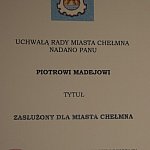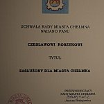 Dnia 28.12.2016 w dwóch częściach odbyła się XXIX Sesja Rady Miasta Chełmna. O godz. 12:00 w sali Państwowej Szkoły Muzycznej przygotowano uroczystość wręczenia tytułów "Zasłużony dla Miasta Chełmna". W tym roku to wyjątkowe wyróżnienie otrzymały cztery osoby: