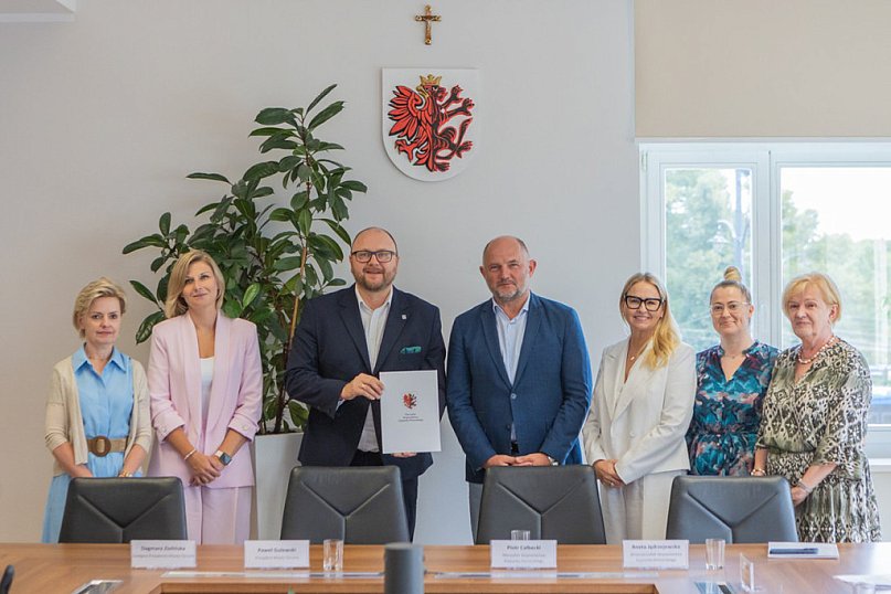 Marszałek Piotr Całbecki i wicemarszałek Aneta Jędrzejewska przekazali w poniedziałek (18 sierpnia) prezydentowi Torunia Pawłowi Gulewskiemu i wiceprezydent Dagmarze Zielińskiej umowę o dofinansowanie inwestycji ze środków PFRON. W spotkaniu uczestniczyła także inicjatorka projektu Krystyna Żejmo-Wysocka, była radna Torunia i była dyrektor Departamentu Spraw Społecznych i Zdrowia Urzędu Marszałkowskiego.