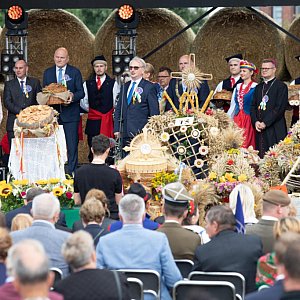 Rano w toruńskim Parku Pamięci została odsłonięta instalacja poświęcona mieszkańcom wsi, chłopom i ziemianom, zamordowanym w ramach, określanej obecnie jako zbrodnia pomorska, ludobójczej akcji „odpolszczania” północno-zachodniej części polskich ziem, przyłączonych wkrótce po napaści Niemiec na Polskę w 1939 roku do III Rzeszy. Uroczysta, bardzo podniosła msza dożynkowa - z udziałem władz województwa, powiatu toruńskiego i miasta Torunia, przedstawicieli społeczności wiejskich regionu i gości - celebrowana przez biskupa ordynariusza diecezji toruńskiej Wiesława Śmigla, odbyła się w katedrze śś. Janów. Wspaniały, głośny, radosny i kolorowy korowód dożynkowy, z końskimi zaprzęgami wiozącymi starostów, orkiestrami dętymi i grupami tanecznymi, przeszedł Rynkiem Staromiejskim i ulicą Chełmińską na Jordanki, gdzie miały miejsce oficjalne wystąpienia.