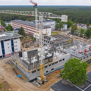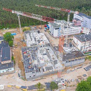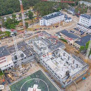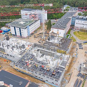 W części zabiegowej szpitala zakończono już prace związane z wykonaniem kanalizacji podposadzkowej, ze zbrojeniem i zalaniem płyty fundamentowej oraz te związane ze zbrojeniem i wykonaniem ścian, stropów i słupów na pierwszym i drugim poziomie budynku. Wykonywano prace nad szalowaniem i układaniem zbrojenia ścian, stropów i słupów na parterze budynku.