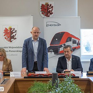 Marszałek Piotr Całbecki i członek zarządu województwa Aneta Jędrzejewska oraz prezes bydgoskiej Pesy Krzysztof Zdziarski podpisali we wtorek (9 kwietnia) umowę w sprawie dostawy pierwszych dwóch czteroczłonowych zespołów trakcyjnych, które ruszą w swoje pierwsze trasy latem 2027.