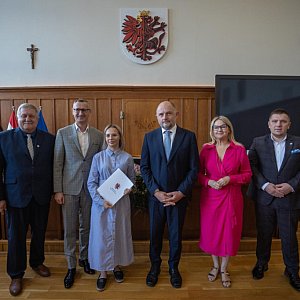 Marszałek Piotr Całbecki, wicemarszałek Aneta Jędrzejewska i członek zarządu województwa Dariusz Kurzawa oraz radni województwa Sławomir Kopyść i Przemysław Ziemecki spotkali się z przedstawicielami beneficjentów naszego programu regionalnego i Programu Rozwoju Obszarów Wiejskich, którzy odebrali 5 lipca w Urzędzie Marszałkowskim umowy o finansowanie projektów.