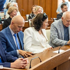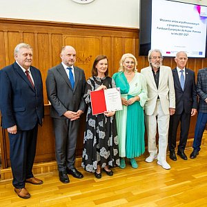 Marszałek Piotr Całbecki, przewodnicząca sejmiku województwa Elżbieta Piniewska i wicemarszałek Zbigniew Ostrowski oraz radni województwa Sławomir Kopyść i Robert Malinowski spotkali się z przedstawicielami beneficjentów naszego programu regionalnego Fundusze Europejskie dla Kujaw i Pomorza 2021-2027, którzy odebrali w poniedziałek (23 września) w Urzędzie Marszałkowskim umowy o finansowanie projektów. Łączna wartość zakontraktowanego właśnie wsparcia to 222 mln złotych.