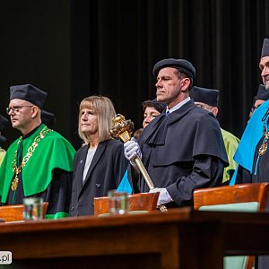 Uroczystość otworzyło przekazanie insygniów rektorskich przez ustępującego rektora prof. Andrzeja Sokalę nowemu rektorowi prof. Andrzejowi Tretynowi.