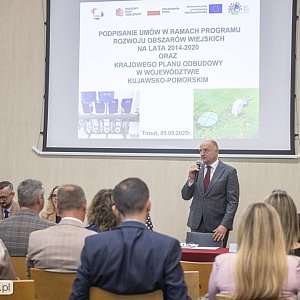 Umowy o dofinansowanie środkami Programu Rozwoju Obszarów Wiejskich i Krajowego Planu Odbudowy przedsięwzięć w dziedzinie gospodarki wodno-ściekowej i modernizacji dróg lokalnych odebrali 5 maja w Urzędzie Marszałkowskim przedstawiciele trzynastu kujawsko-pomorskich gmin wiejskich.