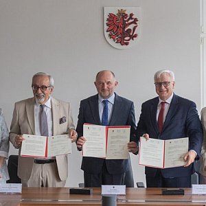 Marszałek Piotr Całbecki i prezes Kujawsko-Pomorskiego Centrum Naukowo-Technologicznego im. Jana Czochralskiego prof. Bogusław Buszewski oraz reprezentujący Polską Akademię Nauk prezes prof. Marek Konarzewski i wiceprezes prof. Mirosława Ostrowska podpisali w czwartek (17 lipca) w Urzędzie Marszałkowskim porozumienie o współpracy na rzecz utworzenia w naszym regionie PAN-owskiego instytutu badawczo-wdrożeniowego.