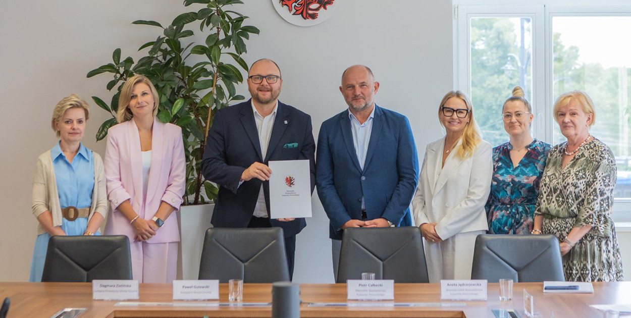Marszałek Piotr Całbecki i wicemarszałek Aneta Jędrzejewska przekazali w poniedziałek (18 sierpnia) prezydentowi Torunia Pawłowi Gulewskiemu i wiceprezydent Dagmarze Zielińskiej umowę o dofinansowanie inwestycji ze środków PFRON. W spotkaniu uczestniczyła także inicjatorka projektu Krystyna Żejmo-Wysocka, była radna Torunia i była dyrektor Departamentu Spraw Społecznych i Zdrowia Urzędu Marszałkowskiego.