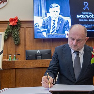 Hołd zmarłemu niedawno prof. Jackowi Woźnemu, radnemu województwa obecnej kadencji, oddali dziś podczas uroczystego spotkania w Urzędzie Marszałkowskim radni i zarząd województwa.
